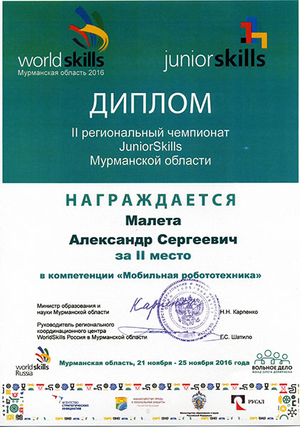 21-25 ноября 2016 г. в Мурманске прошёл II региональный чемпионат Мурманской области JuniorSkills. Учащийся МБУДО "Станция юных техников" Малета Александр завоевал II место в компетенции "Мобильная робототехника". Поздравляем Александра и его руководителя Васильеву Елену Николаевну, педагога дополнительного образования станции юных техников!