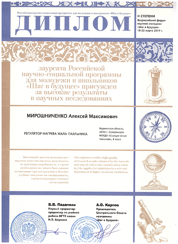 Участие принял обучающийся МБУДО «Станция юных техников» Алексей, ученик 8 класса, в секции «Машиностроительные технологии» с работой «Регулятор нагрева жала паяльника» и получил диплом лауреата II степени.